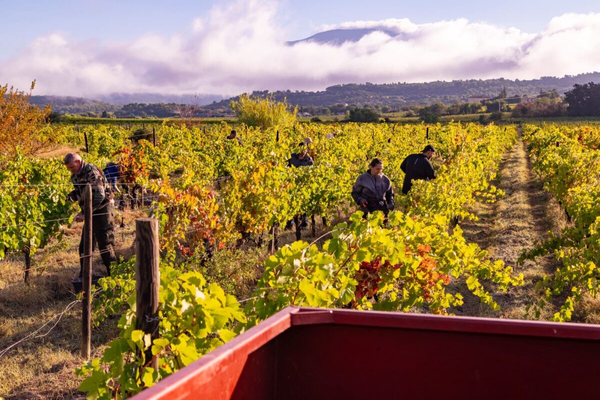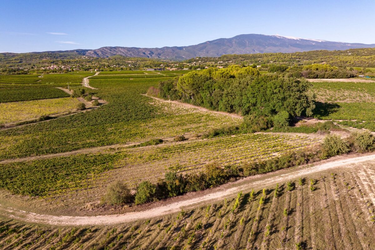 Le mont Ventoux apporte les variations thermiques qui donnent au raisin son caractère ; le soleil lui donne la force, les orages ses réserves liquides capturées dans les couches profondes d’argile bleue.